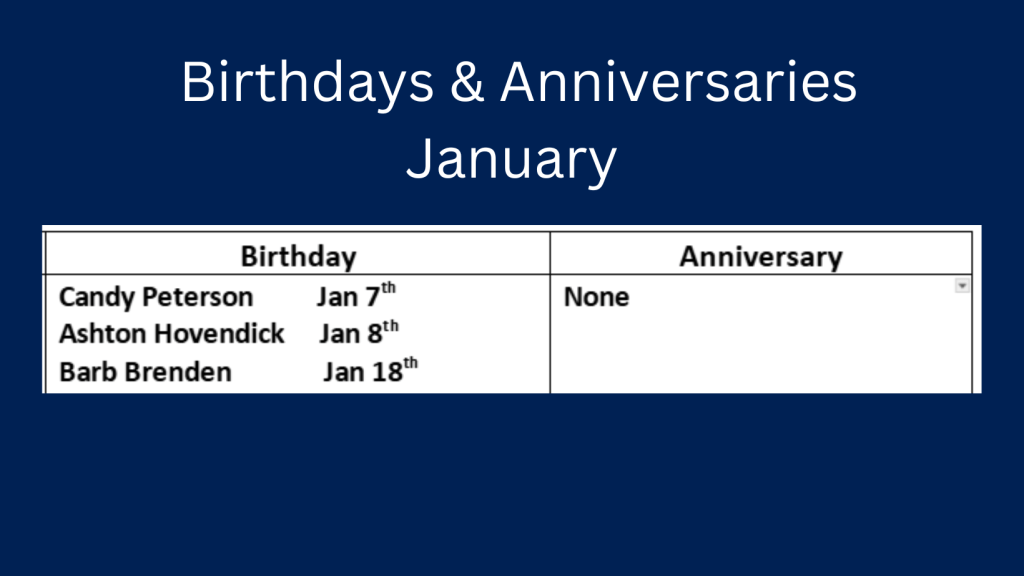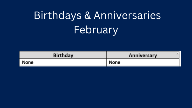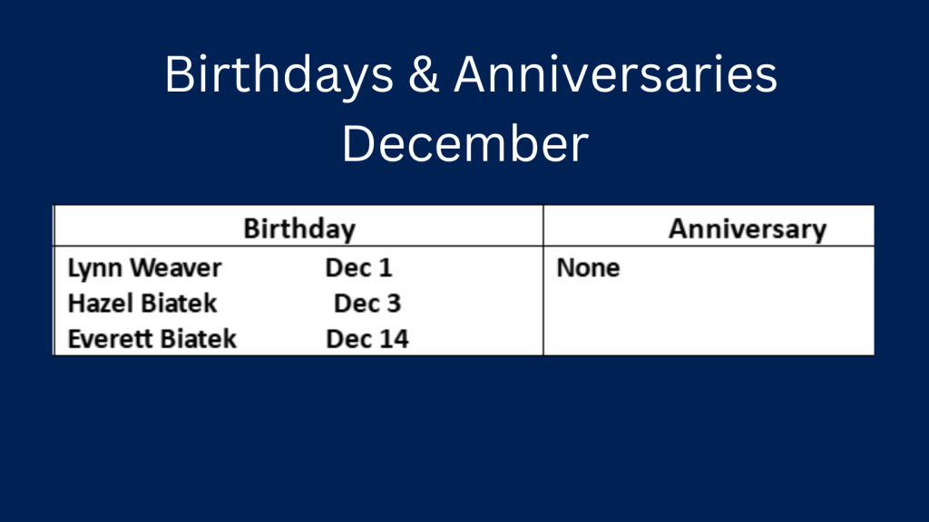 Birthdays-Anniversaries Sunday Holy Eucharist @ 10:00 A.M Share this: Click to share on X (Opens in new window) X Click to share on Facebook (Opens in new window) Facebook Like Loading...